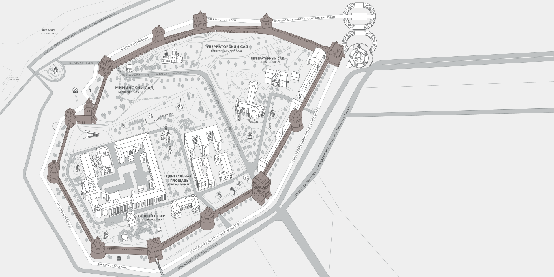 — Почему из всего московского памятника Минину и Пожарскому в Нижний доехал только меч, и почему он не выглядит как меч. — Смотровая площадка. Самый главный вид на слияние двух рек. Почему реки сливаются, но вода не смешивается. — Вечный огонь с Марсового поля. Пост ежедневно несут бедные школьники. Стоит боевой настоящий танк. — Площадь плац-парад. Михайло-Архенгельский собор. — Как устроена боевая башня Кремля изнутри. Как устроена крепость в общем, была ли хоть раз захвачена. И почему больше нет рва.